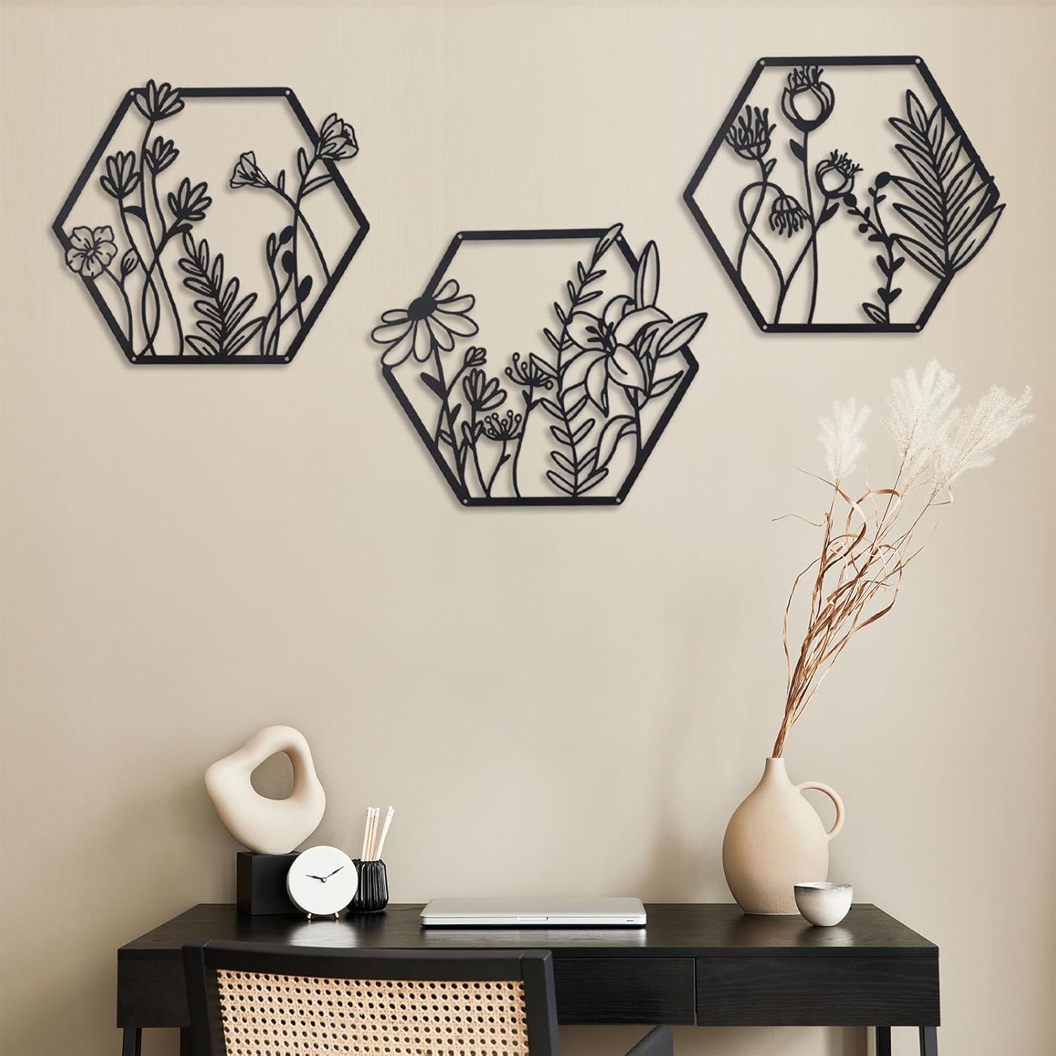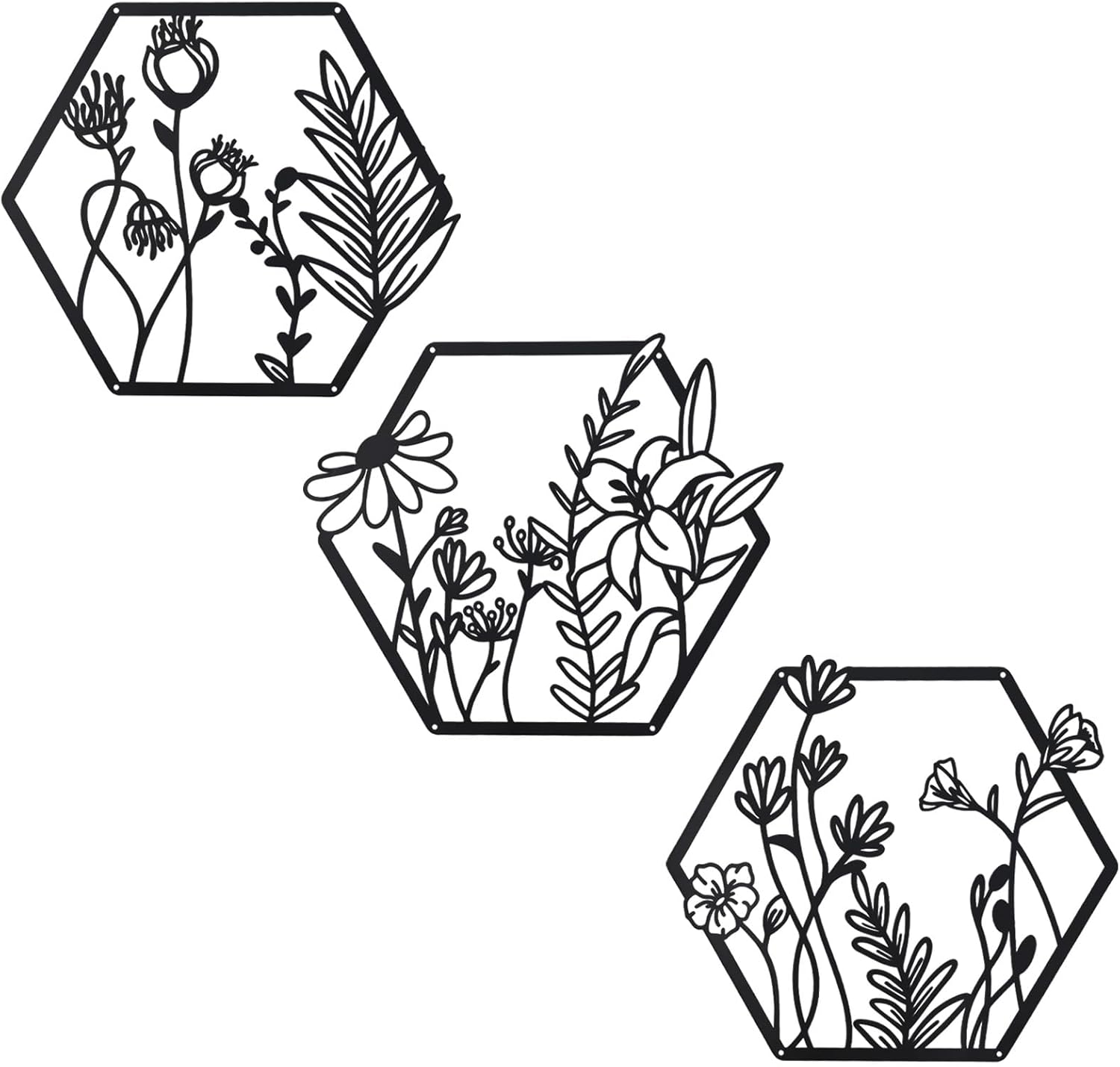 3 Pcs Metal Flower Wall Decor,Farmhouse Flower Art (Black)